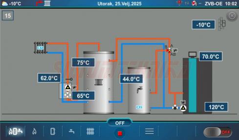 Оснащен горелкой на древесных гранулах (с функцией автоматического розжига и турбулизаторами с ручной очисткой). Цифровое управление котлом с 7″ сенсорным экраном управляет работой котла через вентилятор дымовых газов, контролируемый по дыму и температуре котловой воды. Помимо котла, система управления котлом может управлять одним смесительным или прямым контуром отопления и одним контуром санитарной воды с рециркуляцией, т.е. максимум 3 насосами и одним смесительным клапаном.